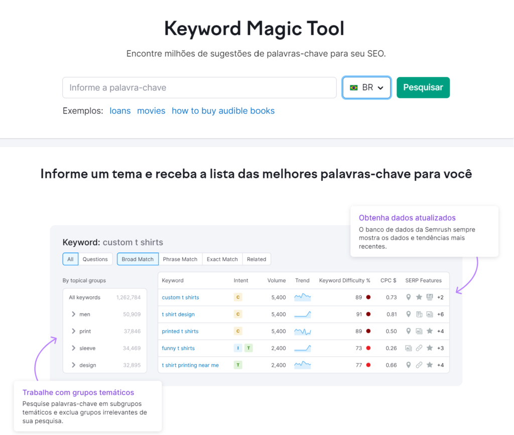 A Keyword Magic Tool, da Semrush, ajuda você a encontrar essas palavras-chave para utilizar nas suas landing pages otimizadas para SEO.