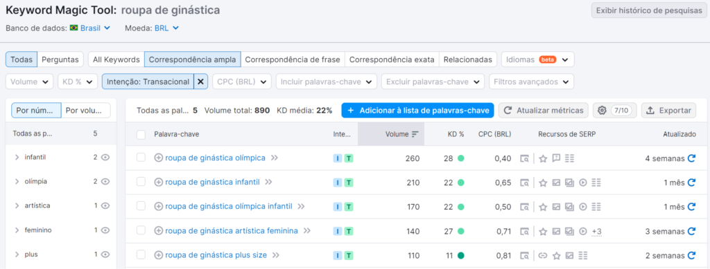Usando o filtro “Intenção”, selecione “Transacional”.