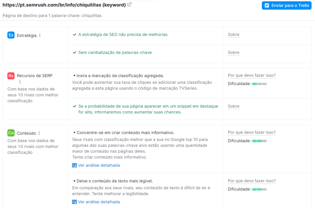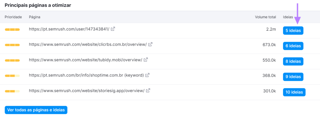 Clique nos botões “ideias” para ver a listas de recomendações de como melhorar o SEO de uma página específica com base nas palavras-chave alvo.
