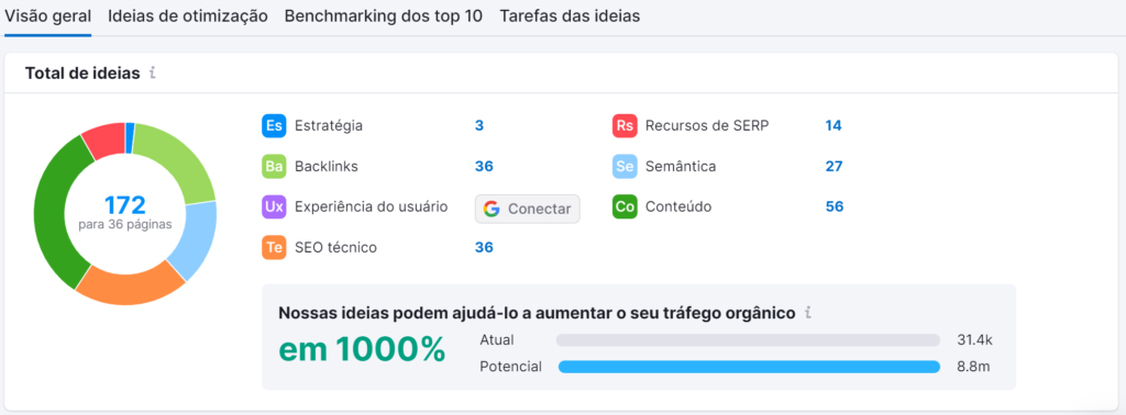 Após configurar seu projeto, você verá um painel com diferentes ideias de como aumentar o tráfego orgânico para suas páginas.