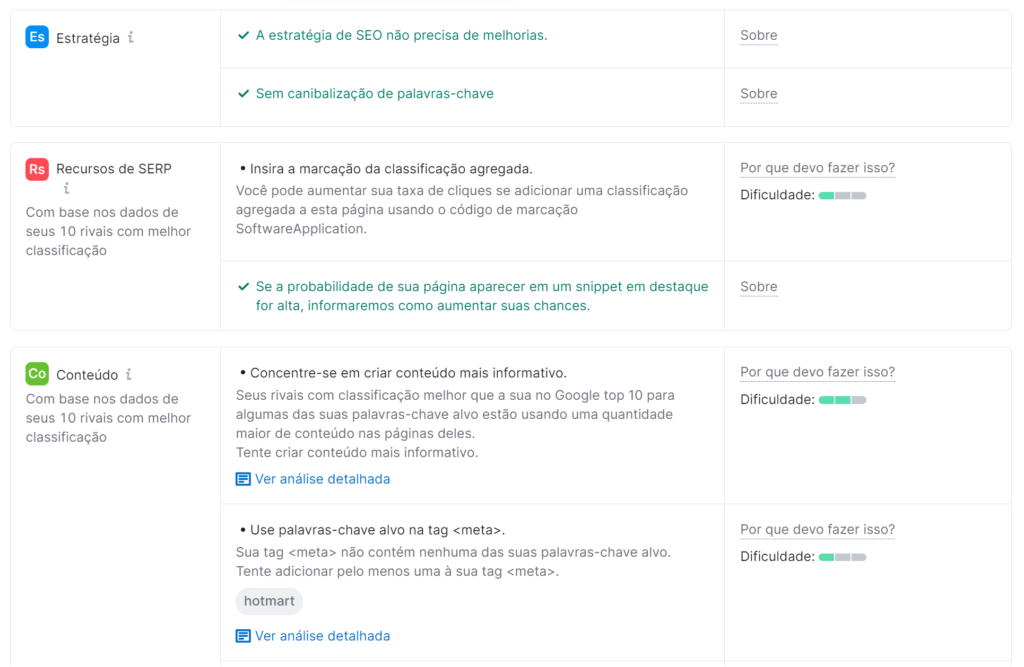 Mas o On Page SEO Checker, da Semrush, pode identificar outros problemas com outros elementos da página.