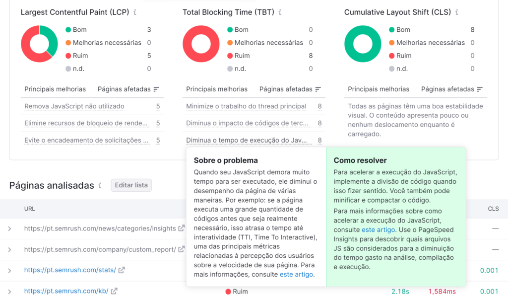 Use a ferramenta Auditoria de Site, da Semrush, para analisar os Core Web Vitals e identificar em quais aspectos você pode melhorar.